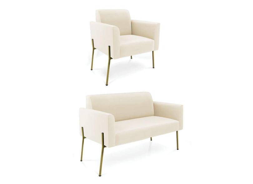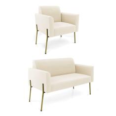 Sofá Namoradeira e Poltrona Pé de Ferro Dourado Salão Marisa Veludo Bege D03 - D`Rossi
