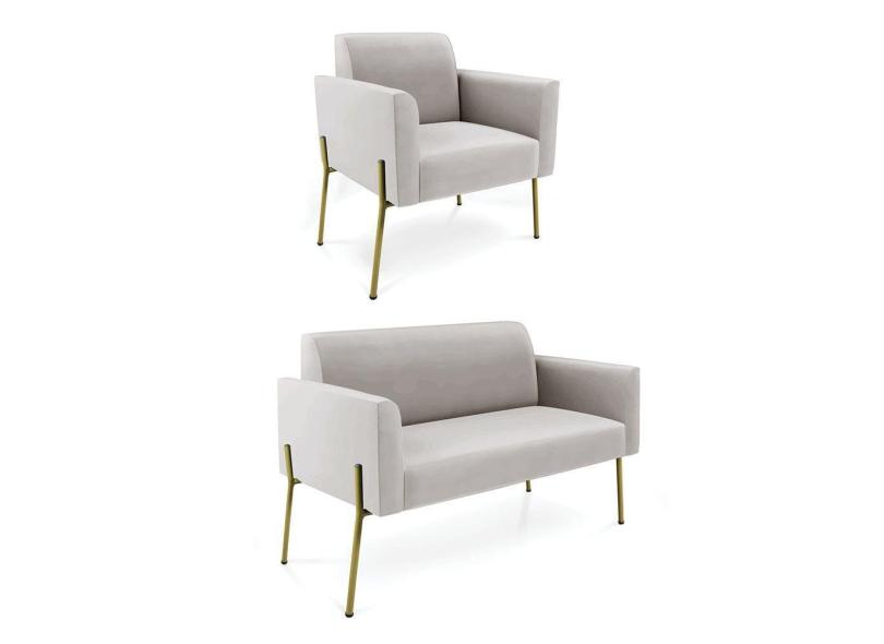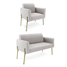 Sofá Namoradeira e Poltrona Pé de Ferro Dourado Salão Marisa Veludo Cinza D03 - D`Rossi