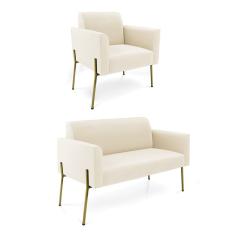 Sofá Namoradeira E Poltrona Pé De Ferro Dourado Salão Marisa Veludo D03 Bege