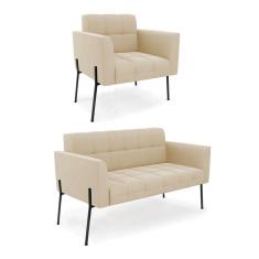 Sofá Namoradeira E Poltrona Pé De Ferro Preto Para Sala Elisa Suede D03 - D'rossi Cor Bege