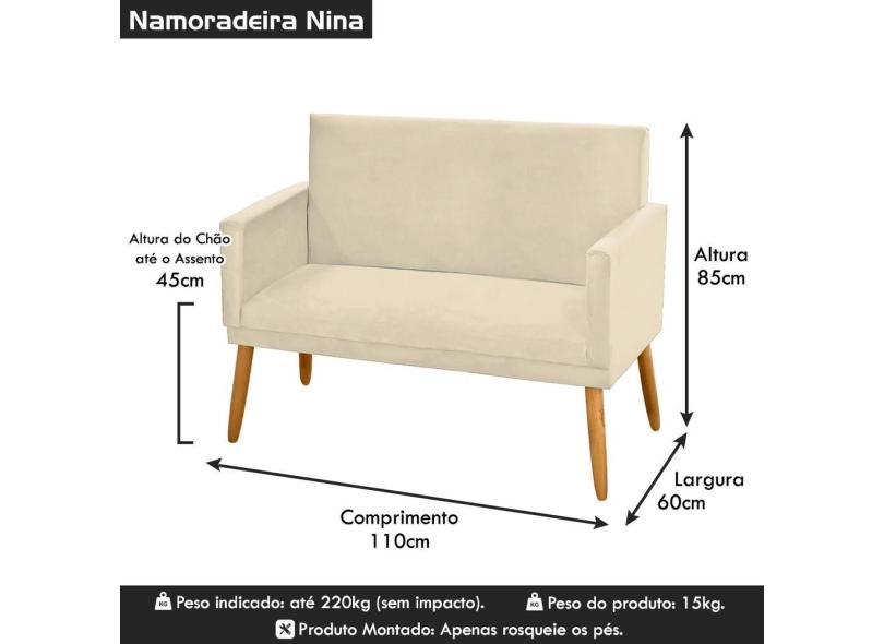 Sofá Pés Palito Estofado de 2 Lugares Nina Tecido Sintético Bege