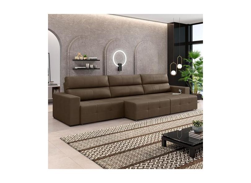 Sofá Retrátil 5 Lugares 314cm 3 Módulos Nero Com Usb Couro Cappuccino