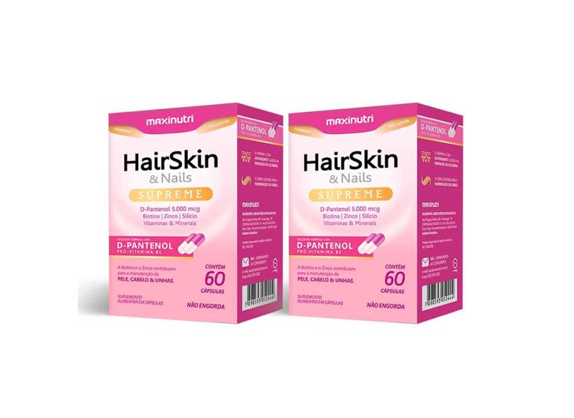 O menor preço encontrado no Brasil para 02 Unidades HairSkin Supreme com D-Pantenol 60 Capsulas Loja Maxinutri atualmente é R$ 110,00.