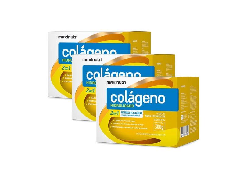 O menor preço encontrado no Brasil para 03 Colágeno Hidrolisado Sachês Manga com Maracujá Maxinutri atualmente é R$ 299,70.
