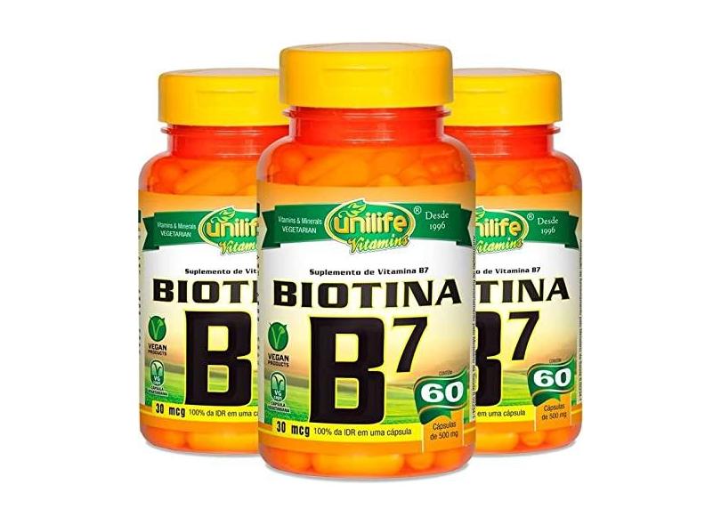 O menor preço encontrado no Brasil para Kit 3 Vitamina B7 Biotina 60 cápsulas Unilife atualmente é R$ 63,90.