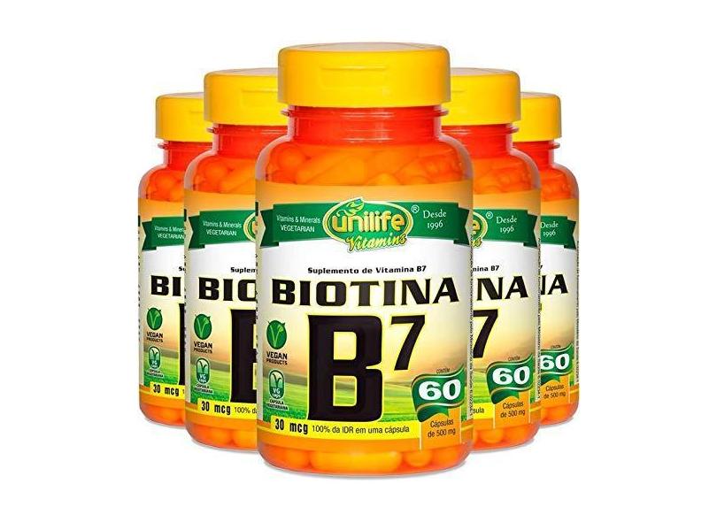 O menor preço encontrado no Brasil para Kit 5 Vitamina B7 Biotina 60 cápsulas Unilife atualmente é R$ 127,38.