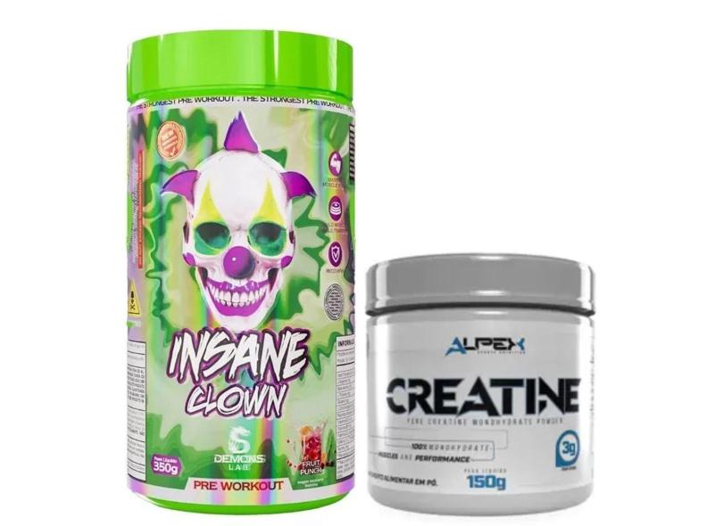 O menor preço encontrado no Brasil para Kit Pré Treino Insane Clown 350g Demons Lab + Creatina Pura Alpex 150g-Unissex atualmente é R$ 116,30.