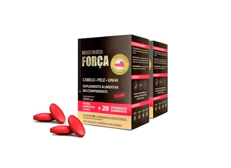 O menor preço encontrado no Brasil para Kit Suplemento Bio Extratus Força Para Cabelos, Pele e Unha - 60 comprimidos - 2 Unidades atualmente é R$ 183,98.