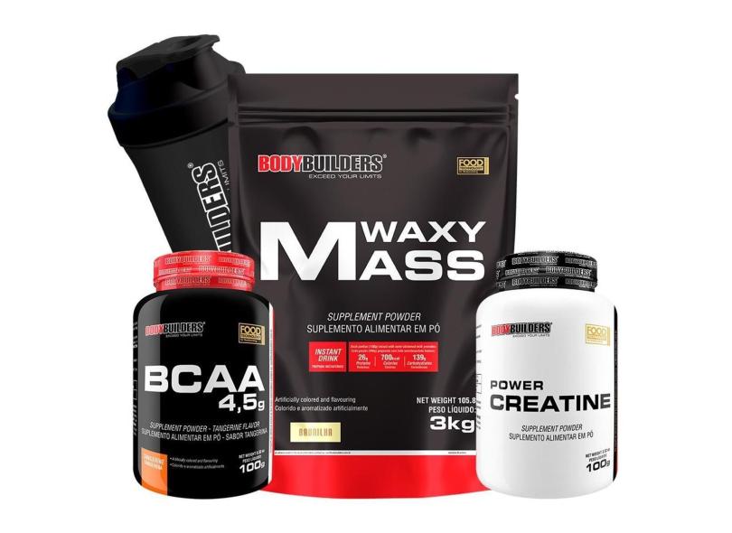 O menor preço encontrado no Brasil para Kit Waxy Mass 3kg + BCAA 4,5 100g + Power Creatina 100g + Coqueteleira - Bodybuilders-Unissex atualmente é R$ 89,92.