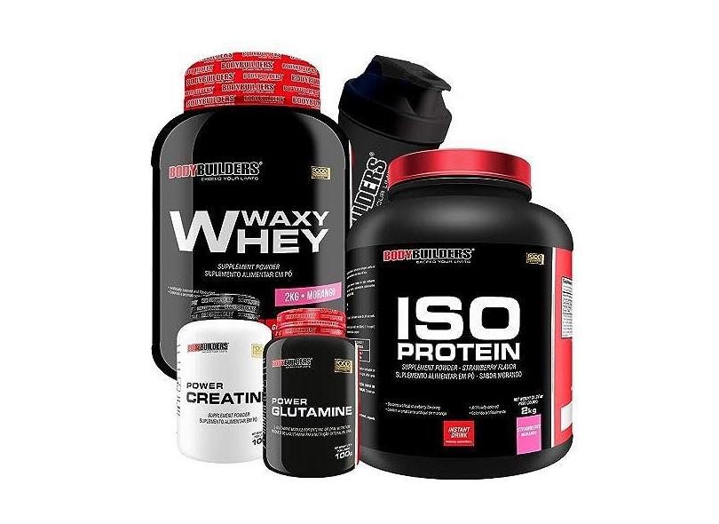 KIT Waxy Whey 2kg + Iso Protein 2kg+ Power Creatina 100g + Power Glutamina 100g + Coqueteleira - Bodybuilders Sabor Morango