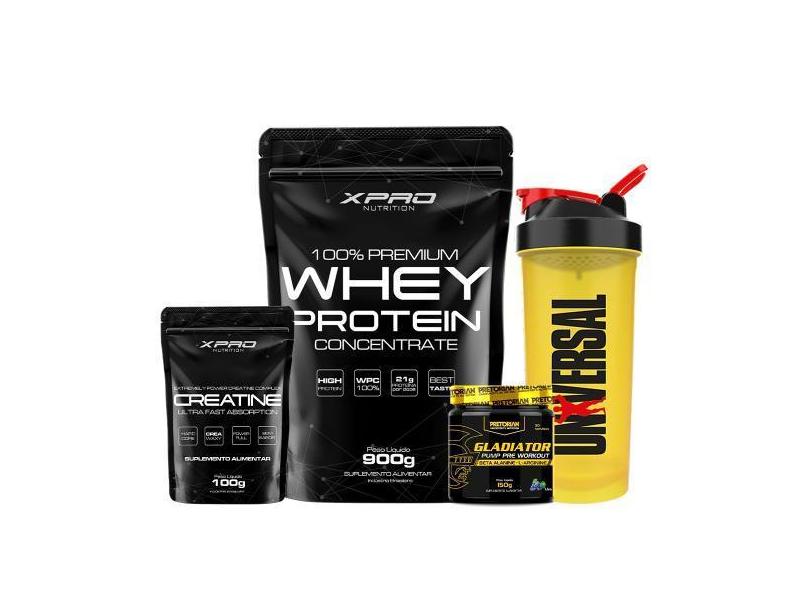 O menor preço encontrado no Brasil para Kit Whey Protein 100% 900G + Creatina 100G - Xpro + Gladiator 150G - P atualmente é R$ 159,99.