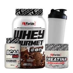 O menor preço encontrado no Brasil para Kit Whey Protein Gourmet + Creatina 300G + Bcaa 100 Cáps + Coqueteleir atualmente é R$ 126,26.