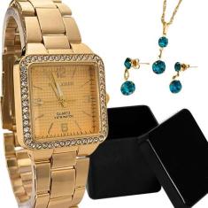 Relógio Feminino Original Quadrado + Brincos Colar Folheado - Azmar Se