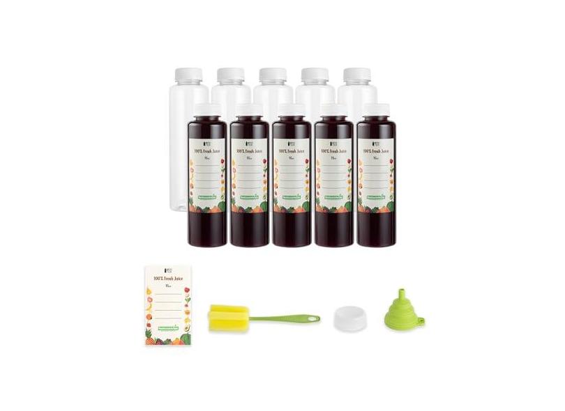 Restaurantware - Garrafa Tek de suco de 473 ml para sucos, 1 garrafa com tampa - inclui etiqueta, tampa, escova e funil, recipiente de suco vazio de plástico transparente, para vitaminas, leite ou