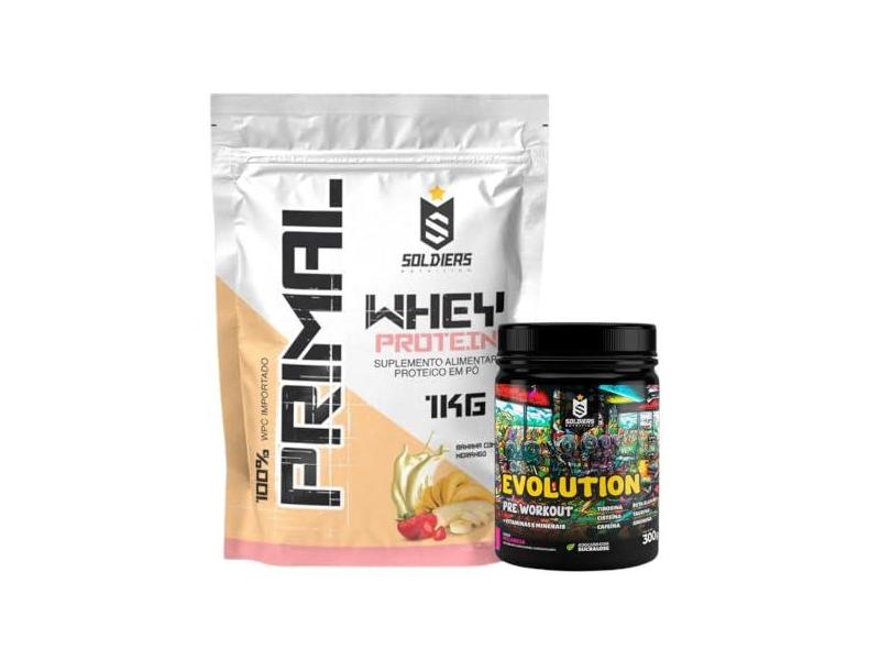 Soldiers Nutrition, Kit: Whey Protein Primal 1Kg 100% Importado + Pré-Treino Evolution - Soldiers Nutrition Sabor:Banana C/Morango;Evolution