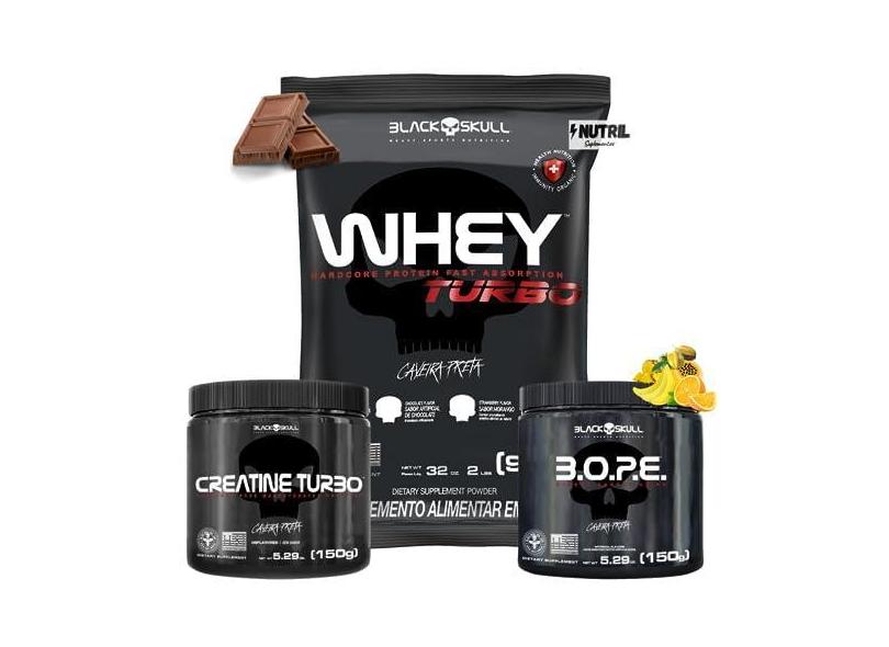 Whey Protein Concentrado + Creatina Monohidratada 150g + Pré-Treino B.O.P.E 150g - Kit Black Skull Para Ganho de Massa e Força (Whey Turbo Chocolate - B.O.P.E Frutas Amarelas)