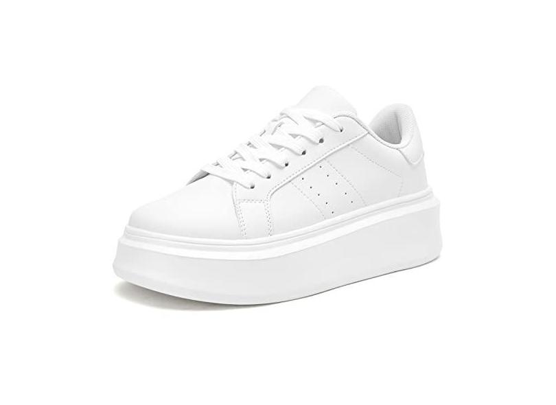 Akk Tênis de plataforma branca para mulheres – Tênis de caminhada de couro clássico ultraleve, confortável, com cadarço, moderno, casual, para uso interno e externo, viagens e trabalho, Branco/prata,