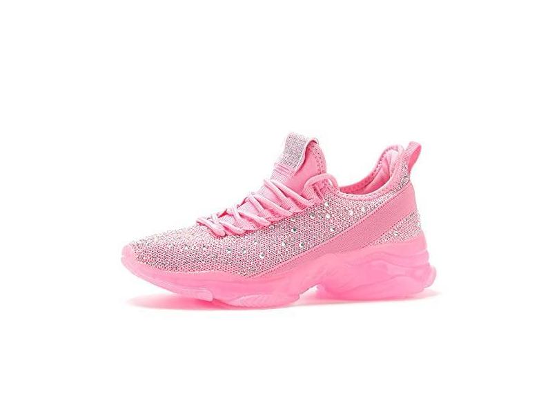 BELOS Tênis feminino de caminhada de malha de strass sem cadarço moderno respirável com glitter, Pedras brilhantes rosa, 38
