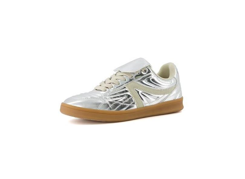 CUSHIONAIRE Tênis feminino Astro retrô, design com cadarço + espuma viscoelástica, larguras disponíveis, Prata metálica, 35