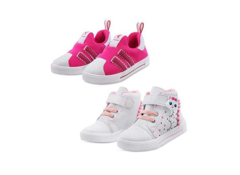O menor preço encontrado no Brasil para Kit 2 Pares De Tênis Infantil Menina Estiloso Gatinha Pink/Branco Gata atualmente é R$ 128,06.