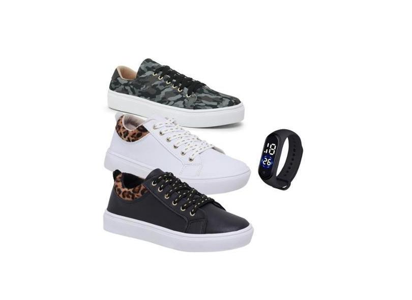 O menor preço encontrado no Brasil para Kit 3 Pares Tênis Feminino Academia Caminhada Esporte + Relógio-Feminino atualmente é R$ 249,90.