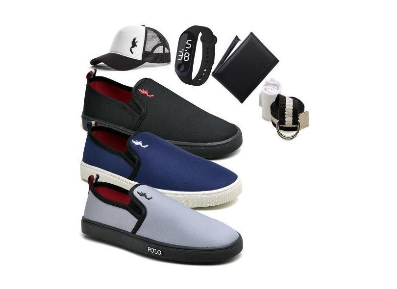 Kit 3 Pares Tênis Slip On Masculino Lona + Carteira + Relógio + Cinto