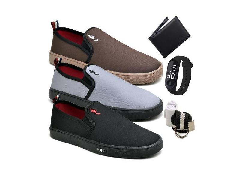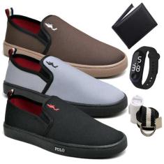 Kit 3 Tênis Slip On Masculino Lona + Carteira + Relógio + Cinto + Meia