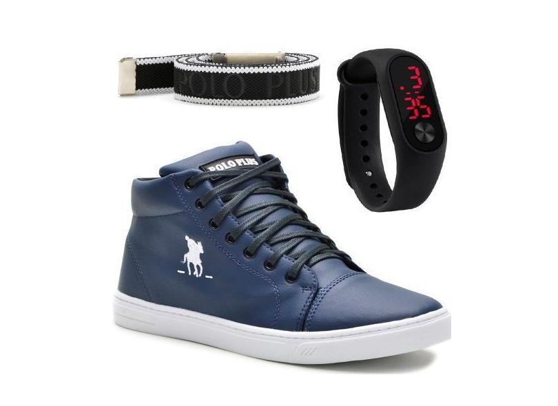 Kit Com Tênis Cano Médio Polo Plus + Relógio Digital E Um Cinto, Azul,