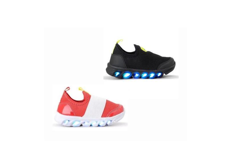 Kit Dois Tênis Infantil Sonic Vermelho Preto Led Luzinha Colorida Calc