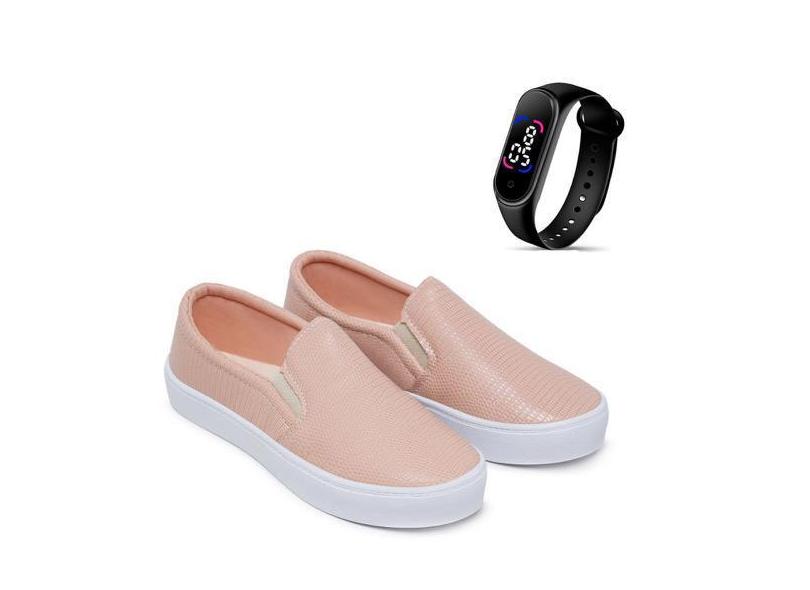 Kit Tênis Casual Feminino Macio Legítimo Slip On Iate + Relógio Touch