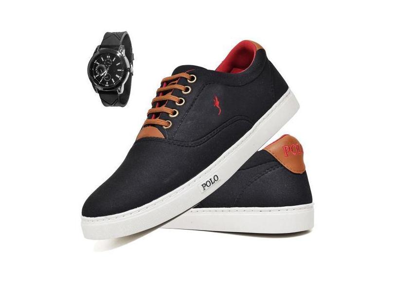 Kit Tênis Casual Masculino Lona + Relógio Analógico - Polo Blu, 46, Pr