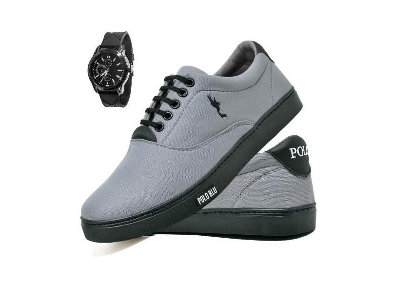 Kit Tênis Casual Masculino Lona + Relógio Analógico - Polo Blu, Cinza,