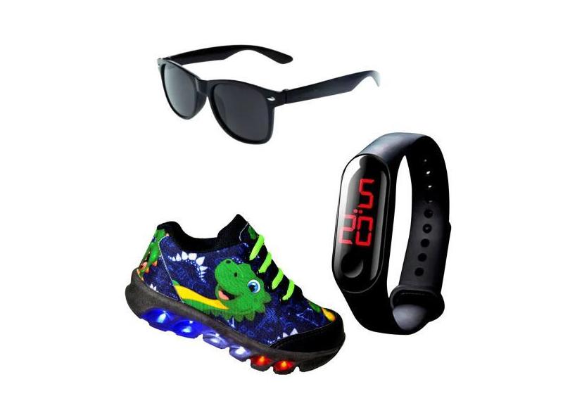 Kit Tênis De Led Infantil Menino Masculino Dinossauro + Relógio + Ócul