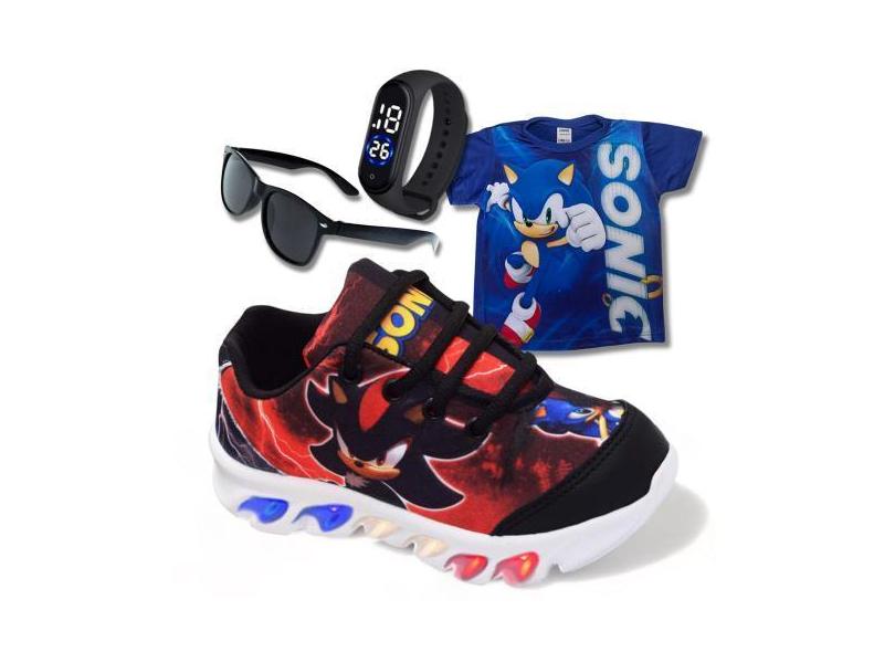 Kit Tênis De Led Infantil Menino Masculino Sonic Shadow+ Camisa + Reló