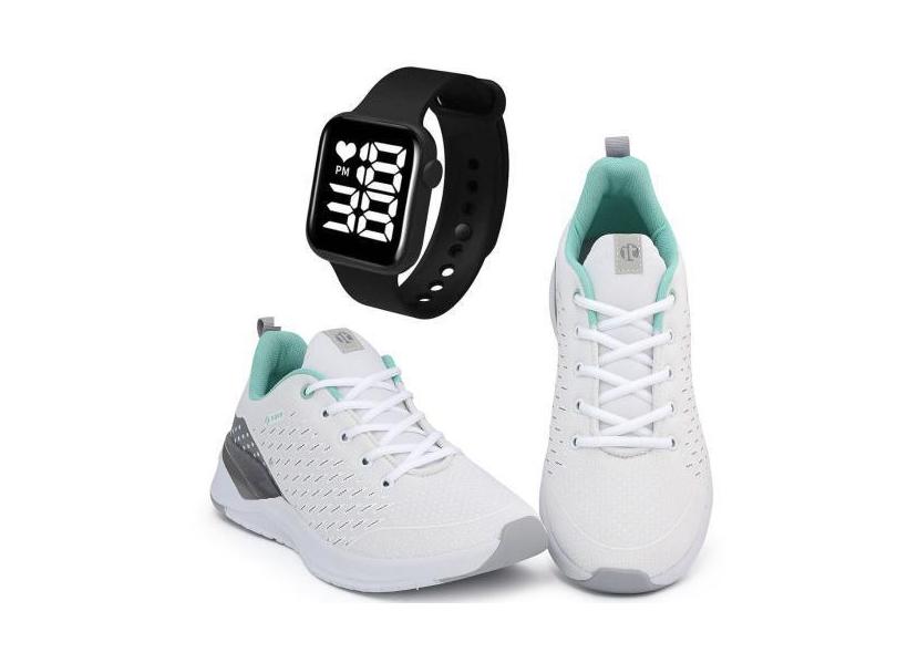 Kit Tênis Esportivo It Shoes Feminino + Relógio Digital, Branco, Azul,