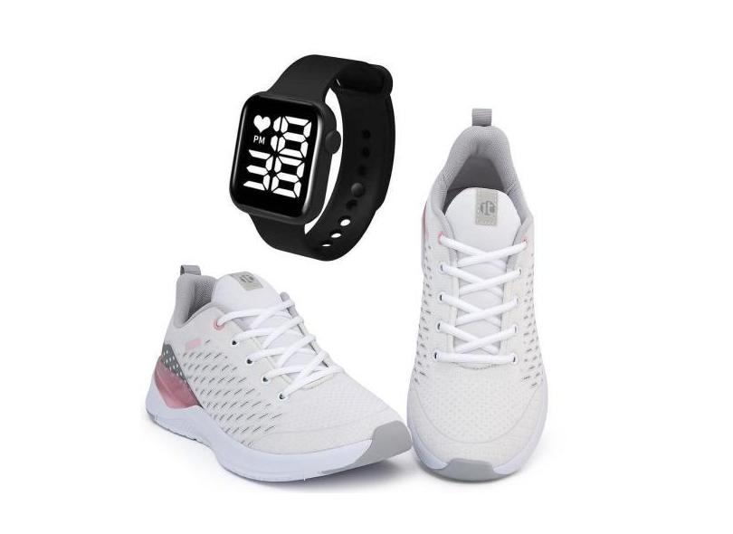 Kit Tênis Esportivo It Shoes Feminino + Relógio Digital, Branco, Rosa