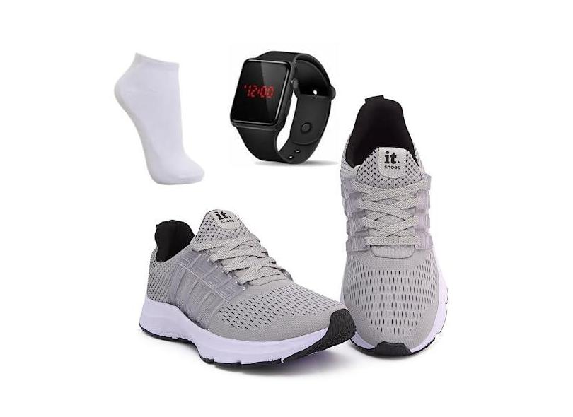 Kit Tenis Feminino Academia + Relógio Digital Led + Meia (Cinza/Branco, BR, Adulto, Numérico, 37)