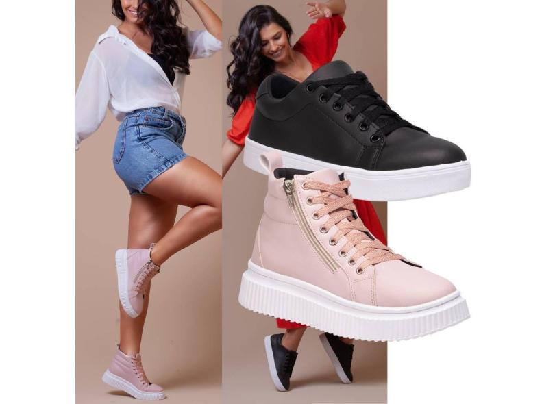 Kit Tênis Feminino Preto Clássico Combinado Com Um Tênis Plataforma Rosa Para Um Toque De Estilo.