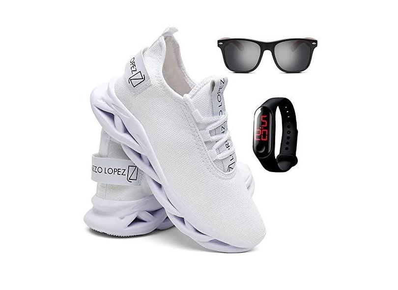 Kit Tênis Masculino de Corrida e Caminhada + Óculos de Sol Madeirado e Relógio - Branco/38