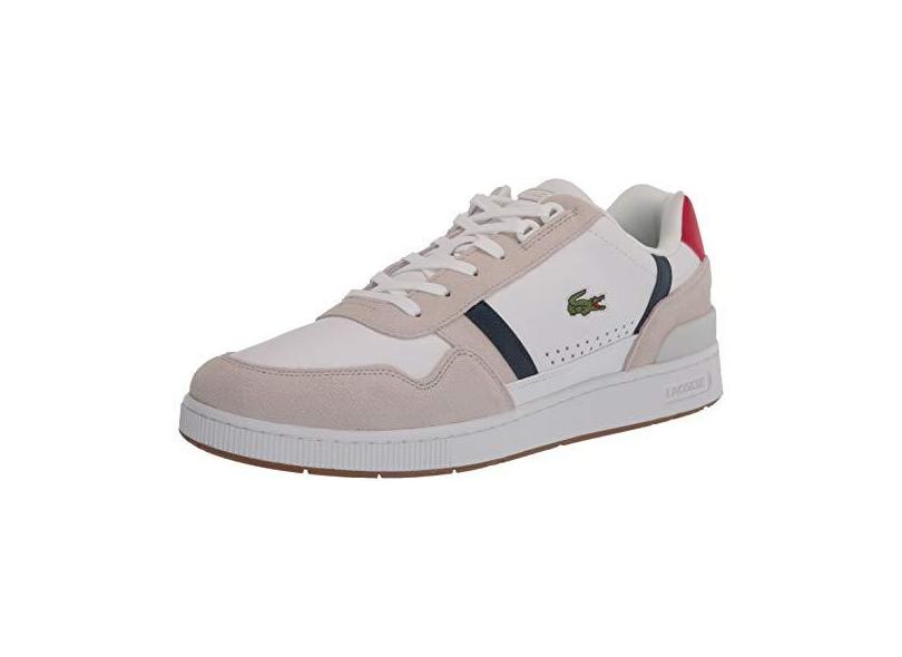 O menor preço encontrado no Brasil para Lacoste Tênis masculino de couro e camurça multicolorido com clipe T, Branco/azul marinho/vermelho, 42 atualmente é R$ 602,80.