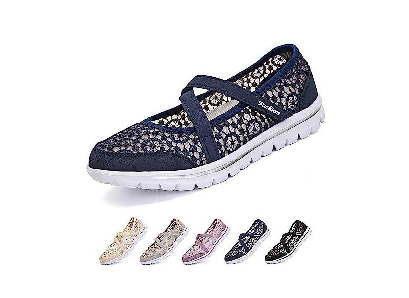 Optigard Tênis feminino de malha de renda ajustável, respirável, plano, casual, antiderrapante, leve, confortável, sem cadarço, boca rasa, para mãe, enfermeira, trabalho, sapatos Mary Jane, Azul, 35