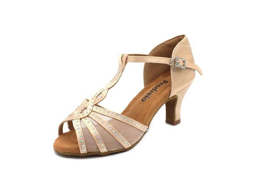 Prodrelo Tênis feminino de dança de malha, cetim nude, salsa, latino, swing com strass, tira em T, bico aberto, para baile/casamento/festa/formal, Cor da pele -- sola de camurça com salto de 5 cm, 36