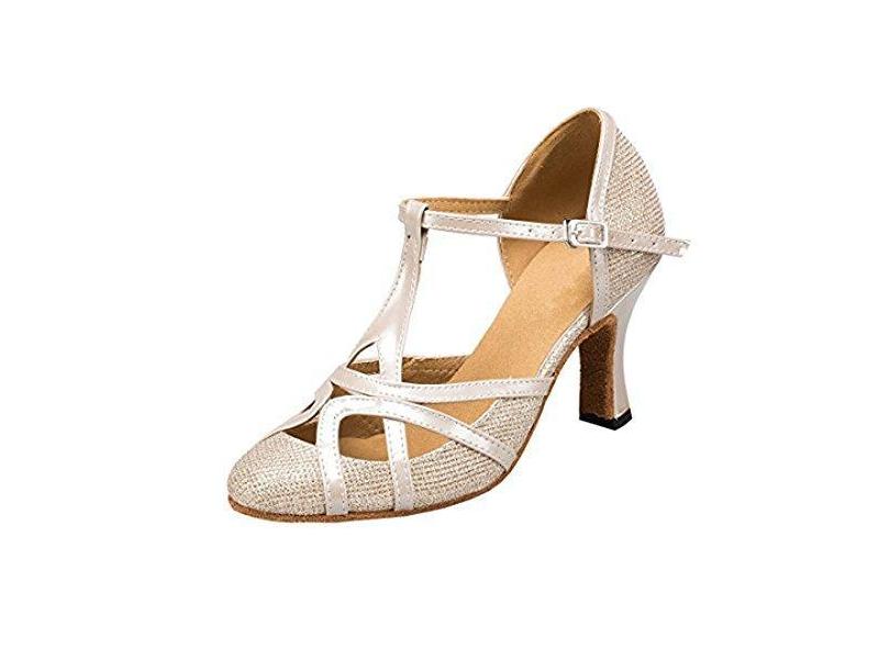 TDA Tênis feminino de dança para festa latina salsa tango sintético com purpurina, tira em T, Champanhe 8 cm, 38