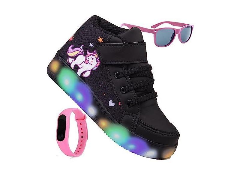 Tenis Botinha Feminino De Led Infantil Unicornio Personagem DIversão Luzinha + Oculos + Relogio Cor:Preto; Ta