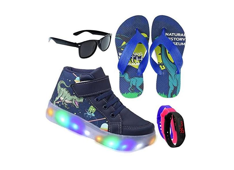 O menor preço encontrado no Brasil para Tenis Botinha Masculino De Led Com Calce Facil Infantil Dinossauro DIversão Luzinha + Chinelo e Brindes Cor:Azul; Taman atualmente é R$ 93,99.