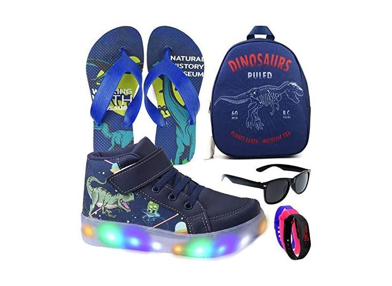 Tenis Botinha Masculino De Led Com Calce Facil Infantil Dinossauro Luzinha + Mochila Chinelo e Brindes Cor:Azul; Tamanho