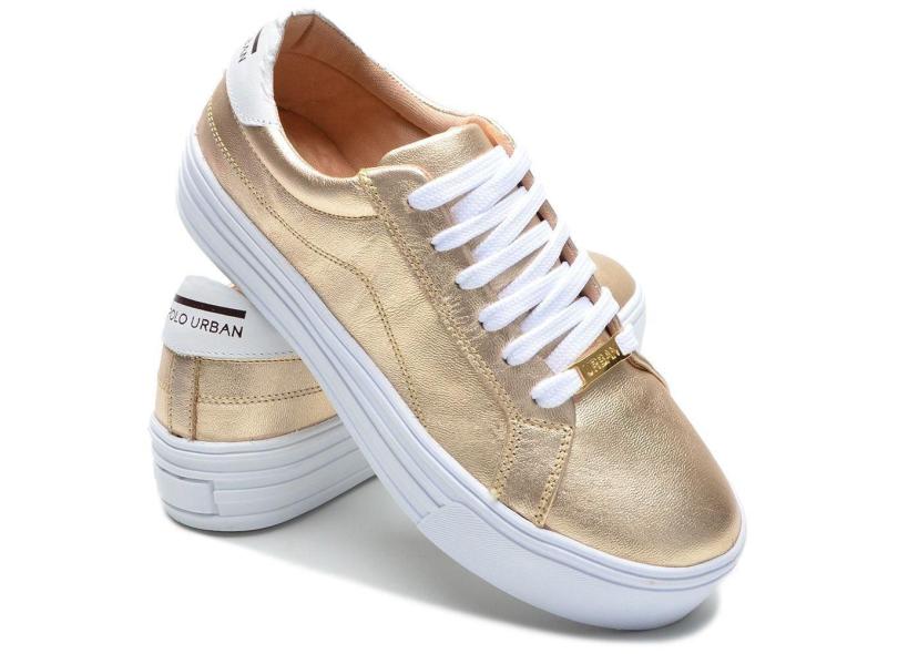 Tênis Casual Feminino Confort em Couro Dourado Polo Urban