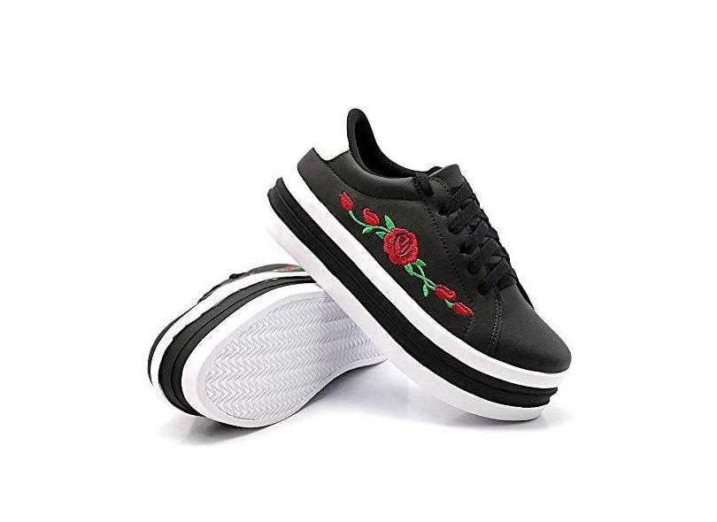 Tenis Casual Feminino Detalhe Bordado Flor e Sola Alta Reta com Listras