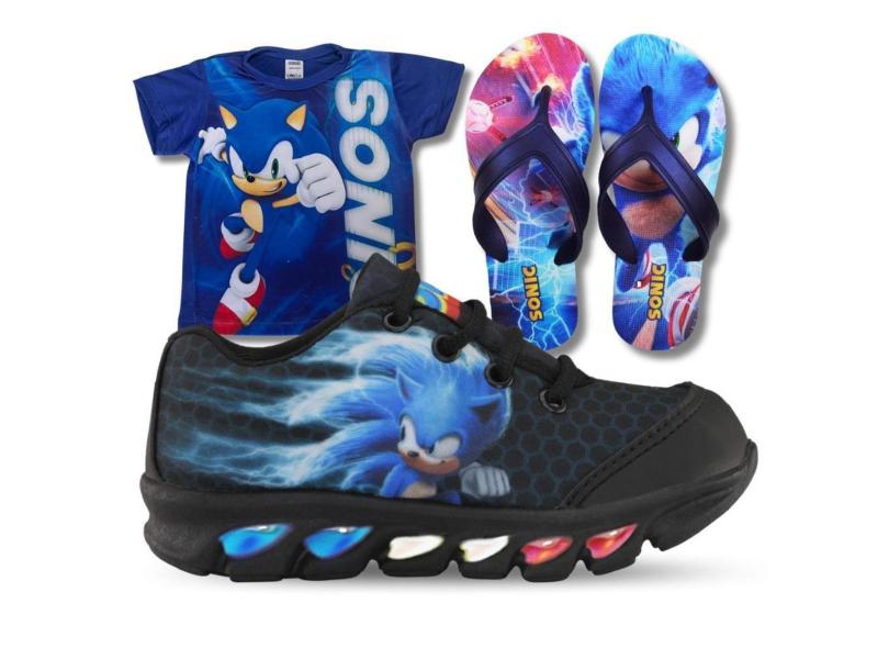tenis de led infantil masculino sonic preto com luzinha meninos mais chinelo e camisa-Masculino