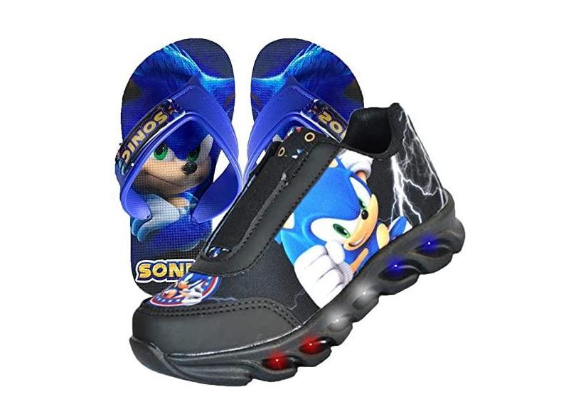 Tenis De Led Masculino Calce Facil Sonic Infantil Meninos Estilo Original + Chinelo Cor:Preto;Tamanho:24